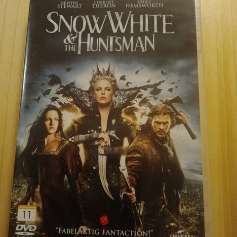 Snow White & The Huntsman DVD film. Inneholder filmen Snow White & The Huntsman med skuespillere Stewart, Theron og Hemsworth. Passer for aldersgruppen 11 år og oppover.