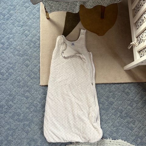 Foret nattpose/sovepose. Passer fra nyfødt opp til ca str 80. Knapper på skuldrene og glidelås i siden.
