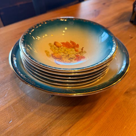Stavangerflint, solsikke, gullkant, vintage, servise, boller, vase, kaffeskål, servering.