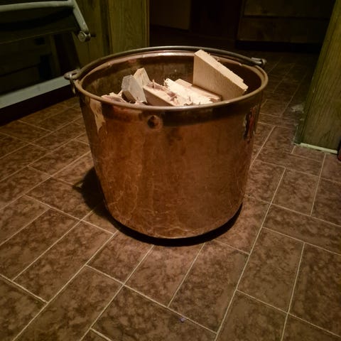 Sjelden vedkurv i kobber produsert av håndverker på Voss.