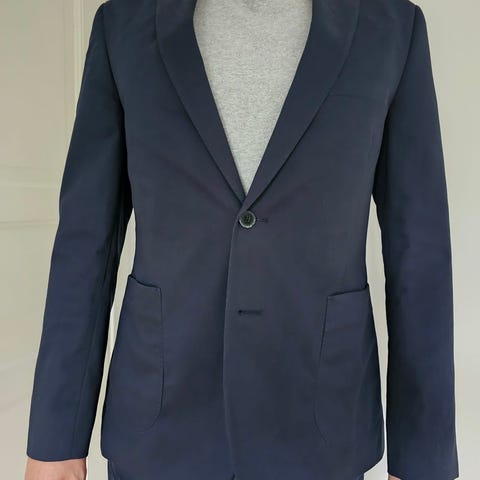 Stilig mørkeblå dressjakke for herre i størrelse 50. Jakken har klassisk design med slag og to knapper foran.