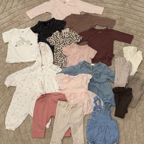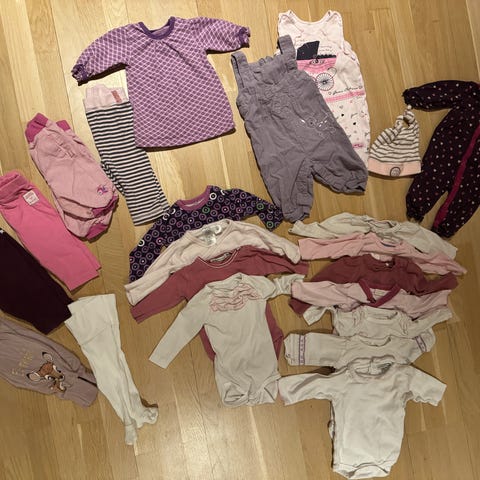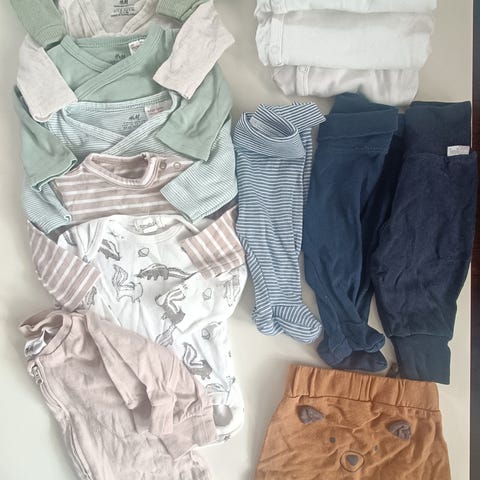 Selger en pakke i str 50 i nøytrale farger, samt en søt velour jakke fra Name it newborn også.. Se egne annonser.