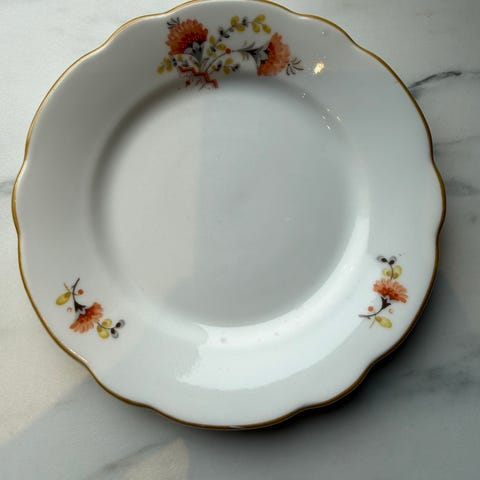 Vintage håndmalt asjett fat i porselen 15 cm blomster og gulldekor