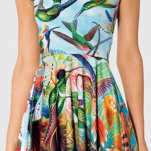 Delias Hawaii tube top / kjole, størrelse medium, kjøpt på Dollskill. Hibiskus blomster motiv, fossefall og sommerfugler. Fargene er blå, grønn og gul. Brukt en gang