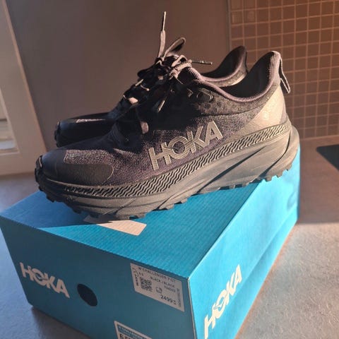 Hoka One One W Challenger ATR GTX løpesko i størrelse 40, designet for løping. Skoene har svart overdel med turkis såle, og er laget for å gi støtte og komfort under løpeøkter.