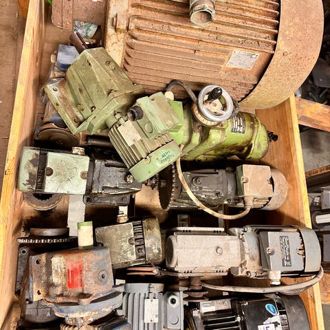 Diverse elektriske motorer, pumper og girkasser samlet på pall. Praktisk for verksted og industrielt bruk.