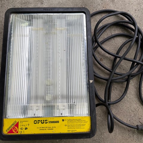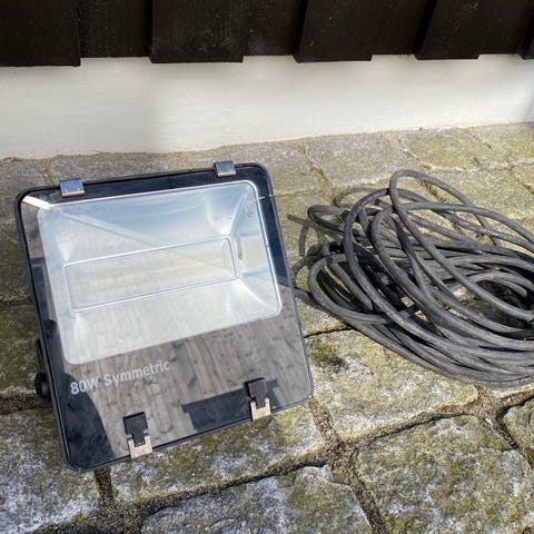 Arbeidslampe med integrert reflektor og lang kabel. Egnet for utendørs belysning eller arbeidsplassbelysning.