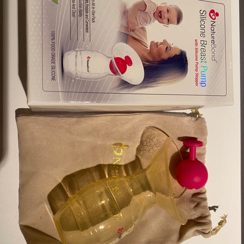 NatureBond Silicone Breast Pump med silikon pumpehette. Laget av silikon materiale, designet for manuell pumping av brystmelk. Inkluderer oppbevaringspose i stoff. Farge: gjennomsiktig med rosa pumpehette.