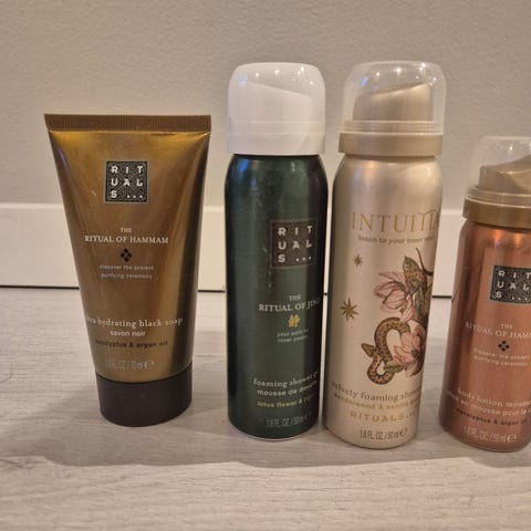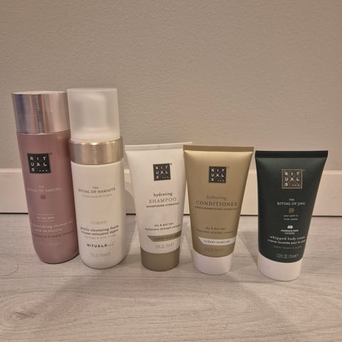 Rituals Sweet Jasmine håndvask og håndbalm sett bestående av en håndvask på 110 ml og en håndbalm på 85 ml. Produktene er laget i Europa og tilhører Rituals Private Collection. Håndvasken rengjør hendene, mens håndbalmen tilfører fuktighet. Begge produktene har en duft av jasmin og er designet for daglig bruk.