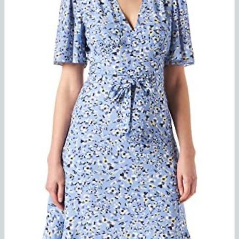 Navy kjole med polkadots, firkløver og blomstermønster fra amerikanske kjoledesigner Harley Viera-Newton - HVN Label . Knepping foran, og belte i livet. Komfortabel og pen. Aldri brukt kjolen, da den er litt stor for meg. Størrelse 6 - tilsvarer ca en medium.
