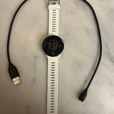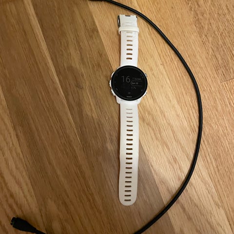 Garmin Forerunner 245 GPS smartklokke med svart silikonrem. Klokken har funksjoner for pulsmåling, skrittelling, og aktivitetsmåling. Egnet for trening og daglig bruk, med digital skjerm som viser tid, dato og aktivitetsstatistikk. Er et bruksmerke i skjermen. USB-C lader følger med.