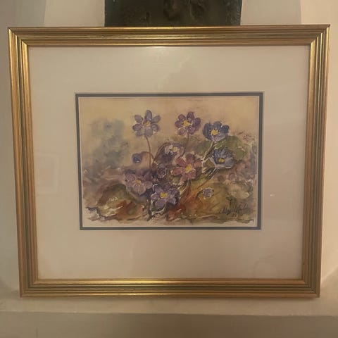 Akvarell av Bitte Hesselberg Meyer Rostad (1931-1997). Mål utvendig 58×48cm, innvendig 35x26cm.