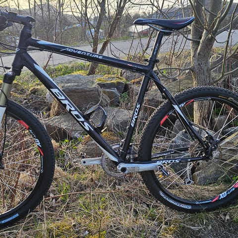 Bros Terreng Herre Terrengsykkel med ramme i standard størrelse. Sykkelen har frontfjæring, skivebremser foran og bak, samt girsystem med flere gir. Trenger ny slange i framdekket og ny kassett.