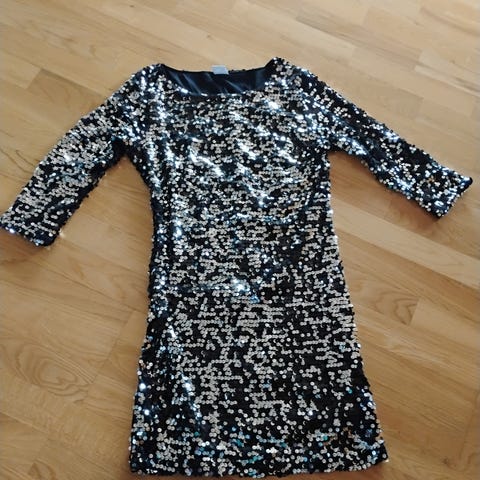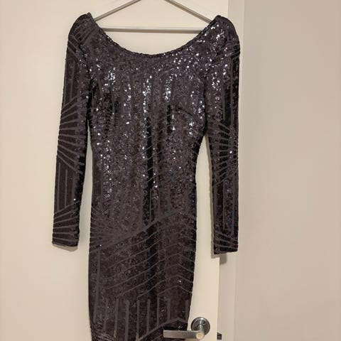 Sisters Point festkjole i størrelse XS, svart farge med paljetter. Kjolen har lange ermer og en dyp V-utringning på baksiden. Materialet består av 95% nylon og 5% elastan, noe som gir en elastisk passform. Egnet som festkjole for kvinner.