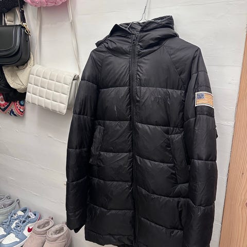 Dunjakke fra Svea i størrelse S, brun farge. Jakken har hette med pelsdetalj. Passer for kvinner, den er varm og er en god jakke.