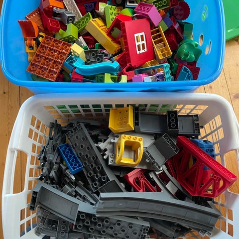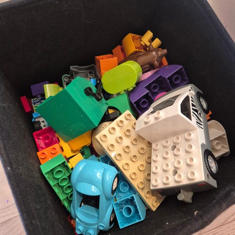 9,5 kg duplo selges. Det er en miks av klassiske klosser, alfabetklosser, kjøretøy og kulebane