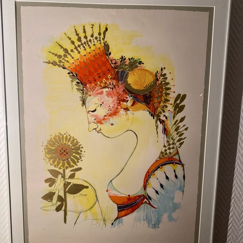 Girl with fruits. Trykk, printer in Denmark by Pernille & Rosengreen Signert Bjørn Wiinblad H: 72 B: 52 med hvit ramme av hard plast. Trykket har små svake bretter i kartongen, derav prisen Kr. 750,-