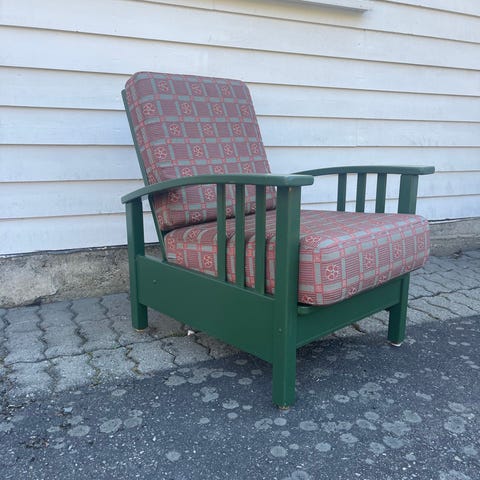 Flott lenestol, jakt stol😉. God å sitte i , kun trekket som er litt slitt på armlenene og litt i sete, ellers hel og fin, man kan sy trekk over armlenene med reste stoff som følger med i samme stoff, hvis man ønsker. Fjeringen i stolen er i god stand.