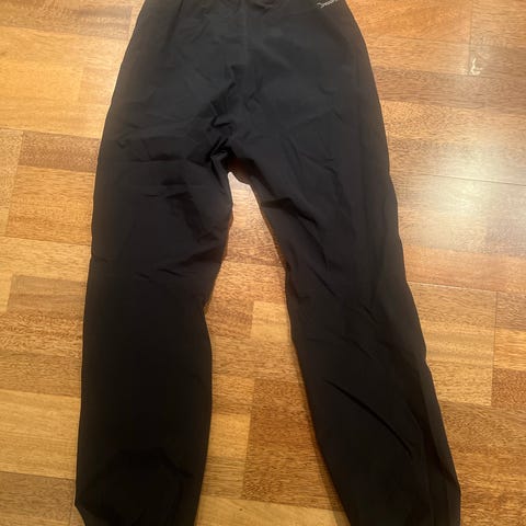 North Peak overtrekksbukse for dame i størrelse 44. Fargen er svart, og buksen er laget for fottur med elastisk midje og snøring for justering. ( Se bilde 3 der ene metallringen er borte) Materialet er lett og egnet for utendørs bruk.
