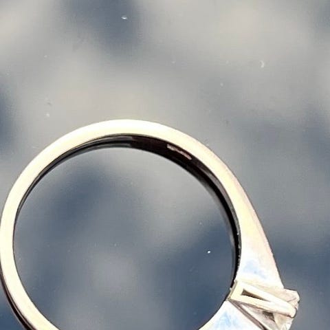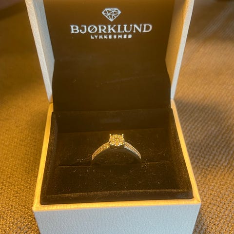Størrelse 54, alt følger med (eske og diamantsertifikat). Ringen fremstår som ny.