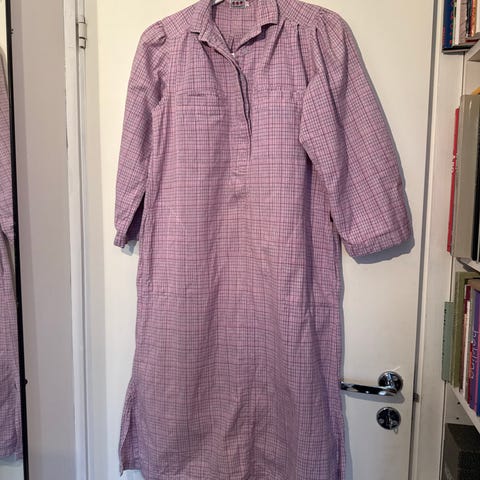 Vintage kjole med korte ermer og knepping i rutete rosa og hvitt stoff. Foret.
