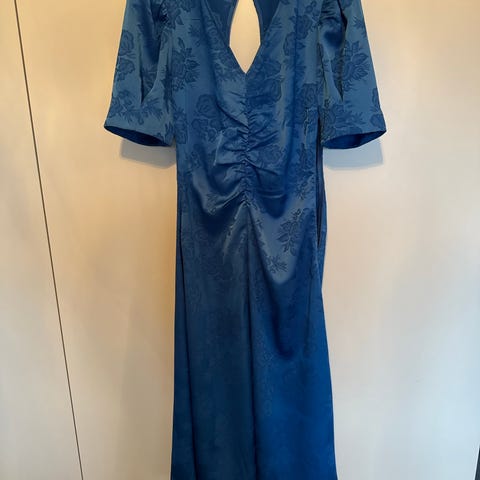 ICHI Festkjole i blå farge, størrelse 38. Kjolen har en strukturert stoffoverflate og puffede ermer. Egnet som festantrekk for kvinner.