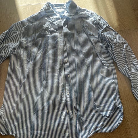 AMISU Skjorte i størrelse XL, farge blå med stripemønster. Laget for kvinner, med knappelukking foran og brystlomme. Materialet er lett og egnet for hverdagsbruk.