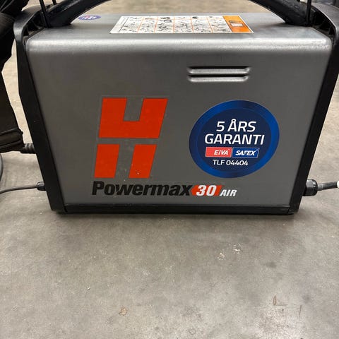 Berthold Powermax 30 plasma cutter. Device designed for cutting metal using plasma technology. Includes power cable and torch with ergonomic handle. Suitable for various metalworking applications requiring precise and efficient cutting.
