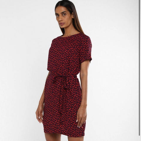 Tommy Hilfiger skjortekjole i mørk blå mot sort bunnfarge med rødt hjerteprint. Kjolen har kort erm og belte i livet for justering. 100% viskose, kan vaskes i maskin. Veldig lite brukt.