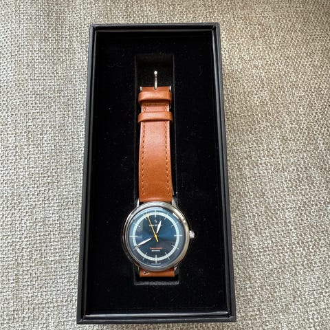 Meget pent brukt Aksla Mark II. Klokken fremstår svært velholdt, med svært få hairlines. Bildene er autentiske og viser klokkens tilstand. Klokken kommer med brun Italiensk lærreim, eksklusiv pianolakkert treboks og garantikort. Ukjent servicehistorikk.