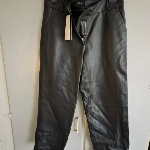 Selger denne tøffe «skinnbuksen» ikke ekte skinn. I str XS. Mye stretch så passer en str S.