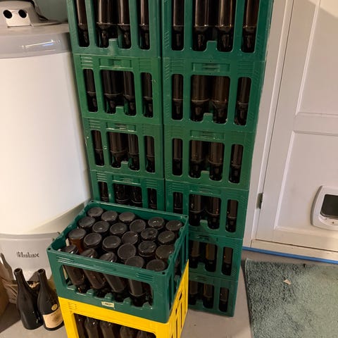 Hjemmelaget flaskeholder med 12 stk 0,33l flasker. Flaskene er rengjorte og bare å desinfisere så er de klare til bruk, har satt på folie så det ikke skal komme støv i flaskene under lagring.