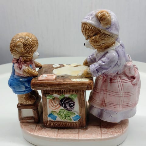 Sjarmerende bamsefigur med to bamser sittende på en kurvsofa. Figuren består av to deler – sofaen og bamsene kan tas fra hverandre. Detaljrik og nostalgisk, perfekt til hyllepynt eller barnerom. Se bilder for mål. 🧸
