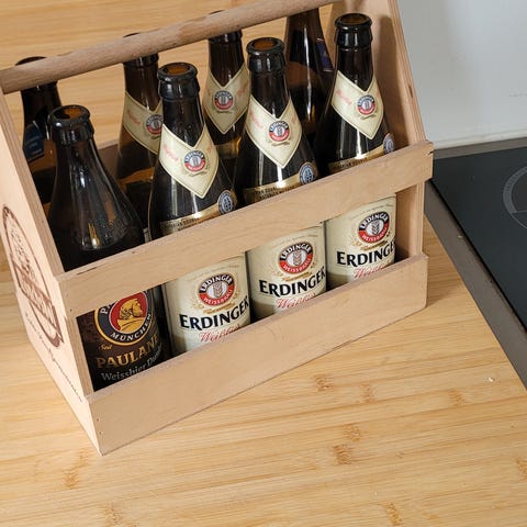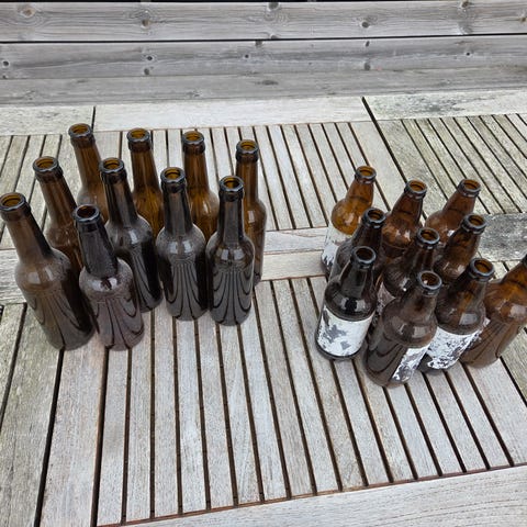 Flaskeholder med 6 stk 0,33l flasker. Flaskene er rengjorte og bare å desinfisere så er de klare til bruk, har satt på folie så det ikke skal komme støv i flaskene under lagring.
