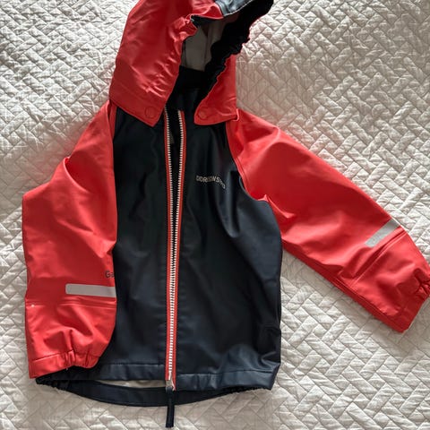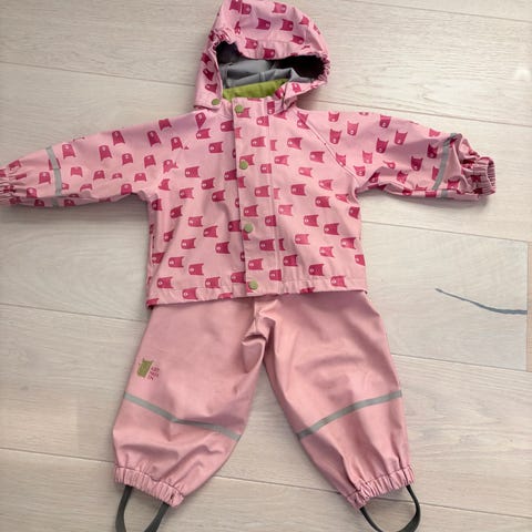 Didriksons regntøy selges da de har blitt for små, mye regntøy igjen. Pent brukt. Litt misfarging nederst inni jakken, ellers fin. Se bilde. Gode regnklær med en flis kant inni jakken.