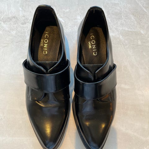 Sorte Derby , flats skinnsko fra Arche selges kr.500,-. Nypris kr.2498,-. Str.38. Brukt bare 1 gang. Dustbag og eske følger med. Kan sendes.