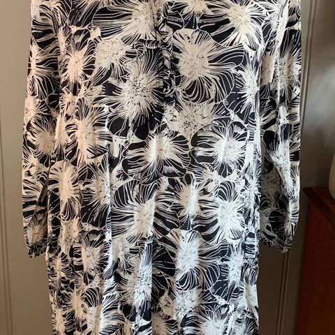 Pen kjole eller tunika fra Masai i svart og beige. V- hals, lange armer, knytedetalj nederst. Ubetydelig brukt, fremstår som ny.
