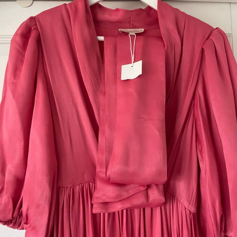 Skreddersydd kjole til spesiell anledning i størrelse M, farge rosa. Kjolen har dekorative detaljer med perler og steiner på overdelen. Materialet er lett og flytende, egnet for formelle anledninger. Er brukt en gang av jente gjennomsnitt str m ca 165 cm høy. Nypris 3.500.