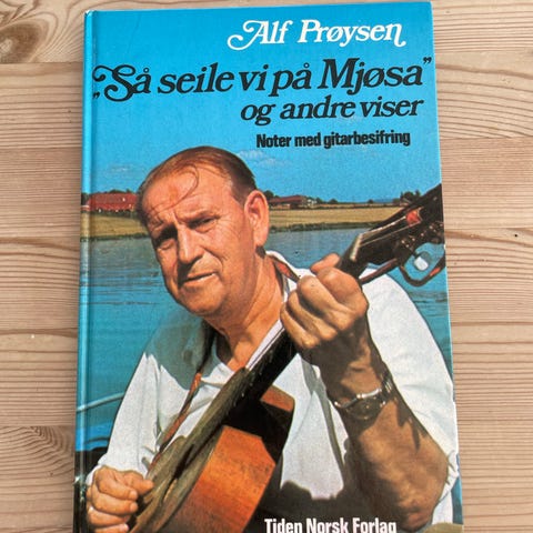 Alf Prøysen Så Seile Vi På Mjøsa og andre viser, bok med noter Utgitt av Tiden Norsk Forlag. Inneholder tekst og noter til flere viser, norsk språk. Hard perm, brukt tilstandsgrad med personlig hilsen på innsiden av foromslaget.