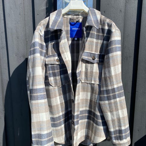 Kjempefin Samsøe Samsøe herreskjorte i størrelse L med flerfarget rutemønster i offwhite, beige, mørk blå. Laget av behagelig lunt materiale i en blanding av bomull, polyester, akryl og ull. Skjorten har knepping foran og brystlommer med klaff. Meget anvendelig lun og behagelig langermet skjorte. Ny pris ca 2.000,-.