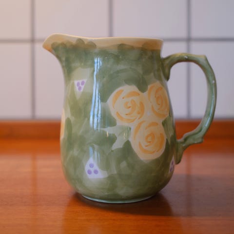 Selger en nydelig håndlaget keramikk mugge med blomstermotiv.