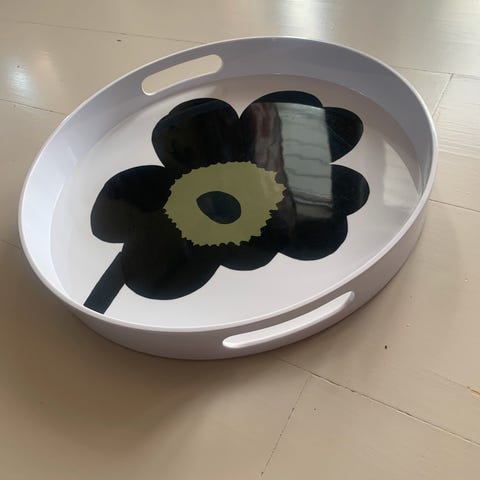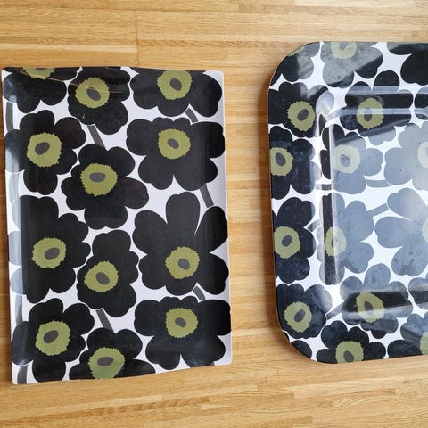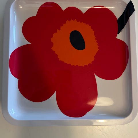 Marimekko Unikko melaminbrett med serveringsbrett i to størrelser. Brettene har et karakteristisk rødt og oransje blomstermønster på hvit bakgrunn. Laget av 100% melamin, egnet for servering og bruk i kjøkkenmiljø. Designet av Marimekko med ZAK Design produksjonsmerking.