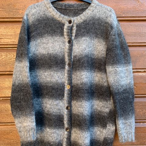 Cardigan i størrelse L for kvinner, offwhite farge. Strikket med mønster i et åpent, diamantformet design. Knappelukking foran.
