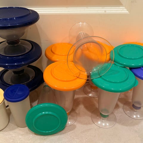 Emaljert stål med oransje lotusdekor og trehåndtak.