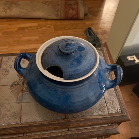 Total høyde ca 26 cm, høyde uten lokk ca 17 cm, total bredde ca 30 cm, diameter åpningen ca 15,5 cm. Må hentes.