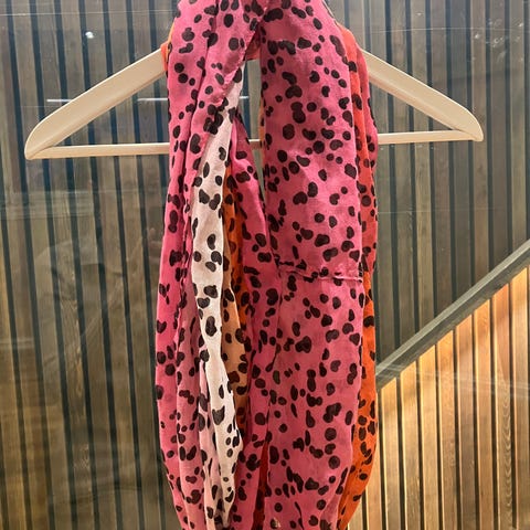 Skjerfet er vendbart med det ikoniske leopard printerne den ene siden og polka dotter på den andre inkl.LV print / logo« her og der»
