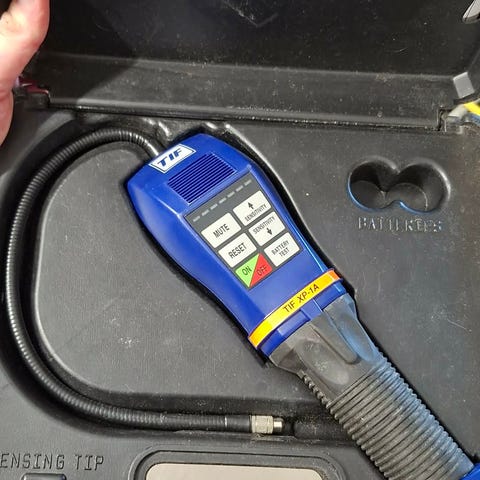 Leak Detective HLD-200 Halogen Leak Detector blå med bærbar koffert. En håndholdt enhet designet for å oppdage halogenlekkasjer i forskjellige systemer. Utstyrt med enkel betjening og fleksibel sonde for nøyaktig lekkasjedeteksjon.