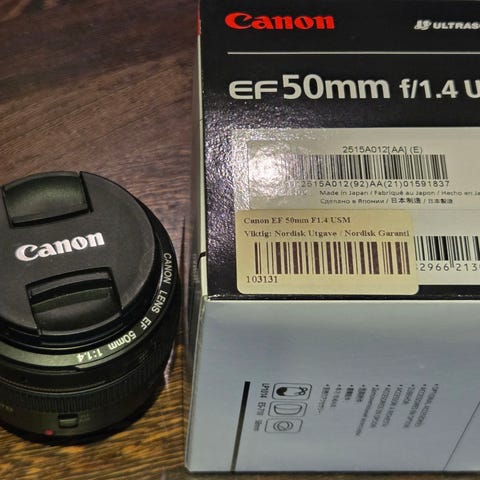 Canon EF 50mm f/1.4 USM objektiv med stor blenderåpning for bedre lysinnslipp. Objektivet er designet for bruk med Canon EOS-kameraer og har ultrasonisk motor (USM) for rask og stille autofokus. Passer til fotografering i ulike lysforhold og gir god bildekvalitet.