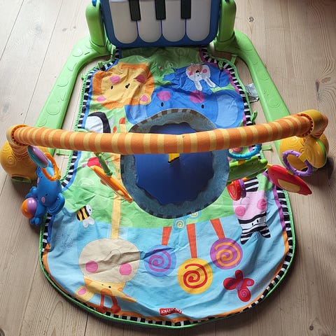 Kan brukes som aktivitetsbord med lyd, lys og trykknapper, eller enkel babygym med leker i krokene som er på undersiden. Den ene av de tre lekene er forsvunnet.