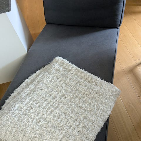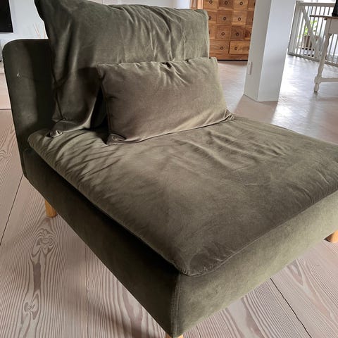 Kryp opp i denne deilige sjeselong for en kosestund. Diskret farge, god komfort. Det er en lys flekk nede i det ene hjørnet (se siste bilde). Det er nye trekk å få kjøpt. Vi har lagt et skinn over.